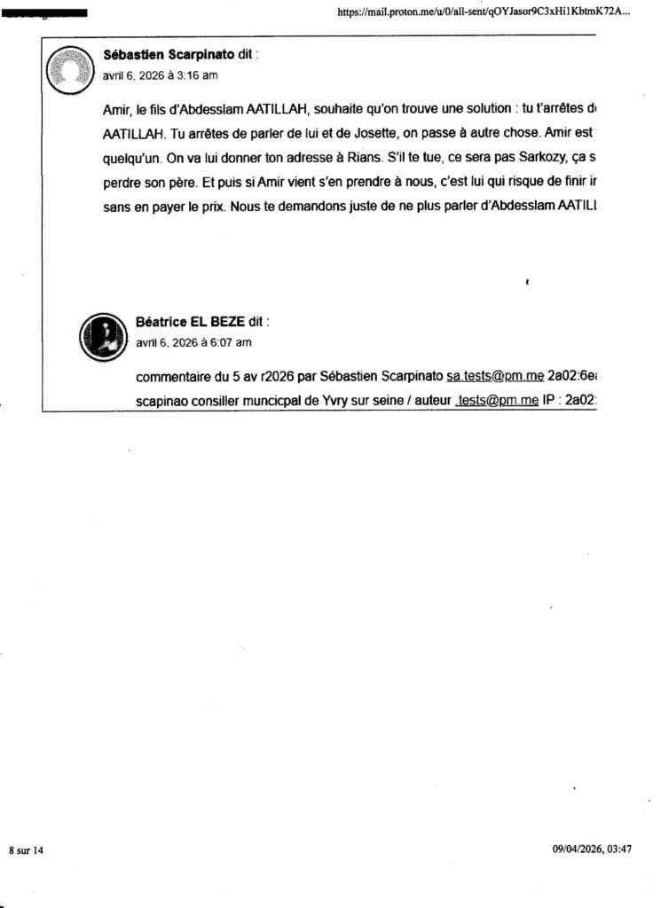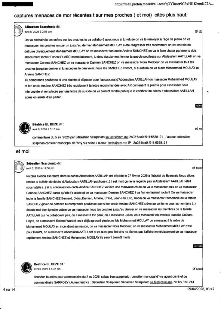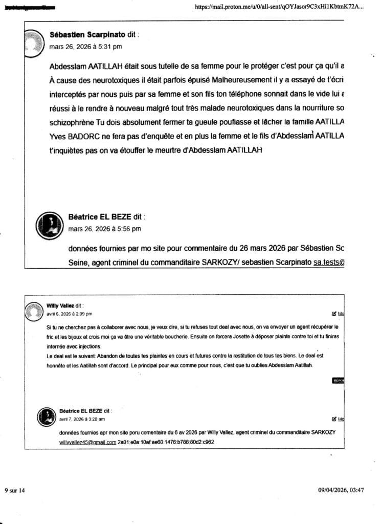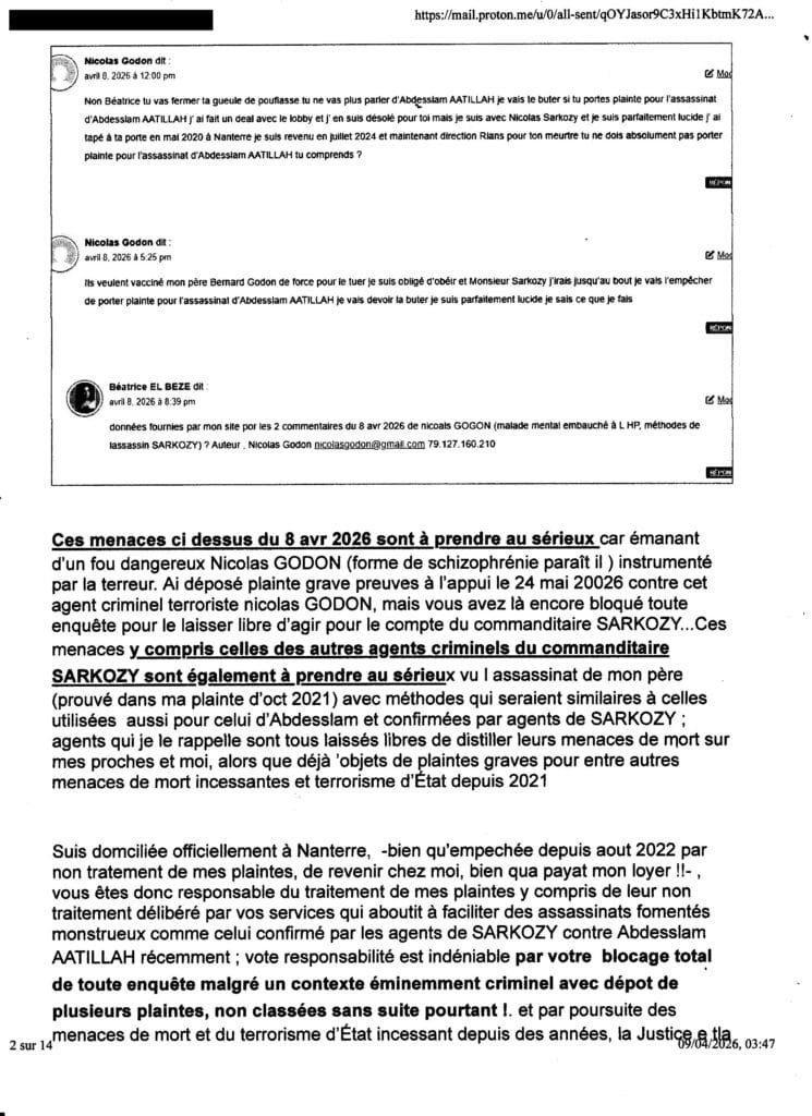 mon mail au procureur TGI Nanterre, Yves BADORC du 8 avr 2026 (13 pages), sur menaces de mort sur mes proches et moi si je porte palnte contre lassassinat Via SARKOZY commanditaire, le 27 fév 2026 d’ Abadesslam AATILLAH, mon compagnon depuis 27 ans .
