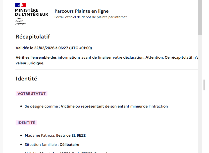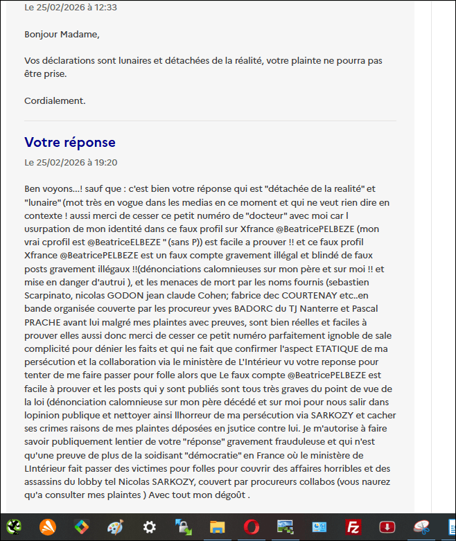 Preuves de mon dépot de plainte en ligne le 22 fév 2026 près Police nationale et la REPONSE HALLUCINANTE DE COMPLICITÉ CRIMINELLE le 25 fév 2026 PAR LE MINISTERE DE L ‘NTERIEUR !! (mis ici publiquement pour ma sécurité au cas où la Police m’embarquerait sur consignes suite a ma plainte en faisant comme si jétais folle comme en 2004) et parce que mes courriers AR sont interceptés par fraude depuis 2022 requêtes, plaintes ..!) ai pourtant refusé dans cette plainte en ligne le rdv avec commissariat de nanterre; en écrivant que c’est pour ma sécurité en raison de plainte en cours contre ce commissariat de Nanterre depuis le 20 sept 2024 (plainte cachée criminellement par procureur BADORC pour m ’empêcher de rentrer chez moi à Nanterre depuis, par menaces de mort incessantes par agents de SARKOZY !