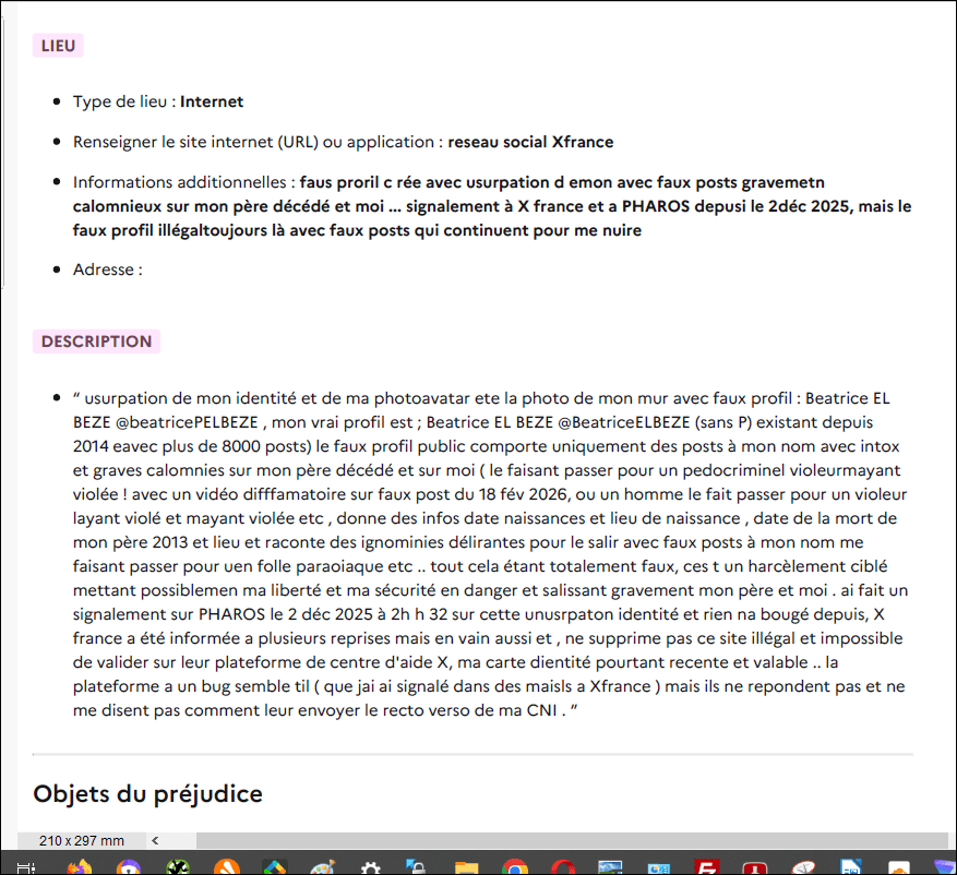 car hors de question que je laisse salir mon père gravement victime( voir preuves et accusations de mon père dans ma plainte plus haut contre lassassin SARLKOZY ; donc ai déposé plainte en ligne le 22 fév 2026 près Police nationale et y ai ajouté un supplément dans la journée pour dénoncer les agents criminels de SARKOZY et leurs meances de mort et chantage, avec preuves enregistrement de ma plainte ( je mets ma plainte publiquement car je me méfie en cotexte de la Police de nanterre . qui mavait faite embarquér menottée devant un pyh=sychaitre en iversant les rôles et en faiant des faux tméoingages en 2004 après m’avoir dit de venir porter plainte suite à une agression physique quelques heures avant par indic travaillant pour eux !) sur mon palier .(méthodes de SARKOZY dans ma cité classée zone sensible