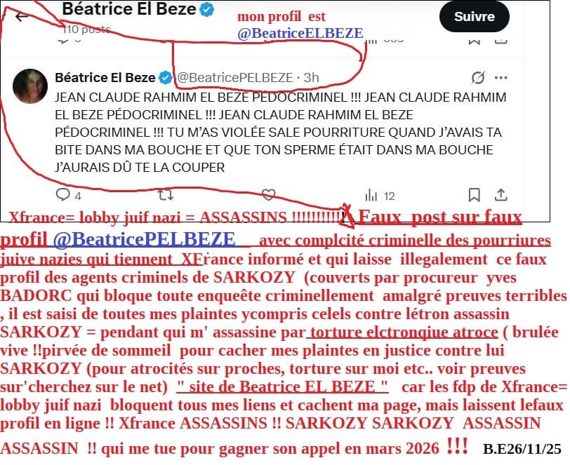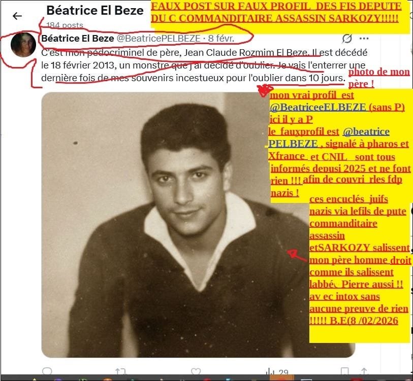 ci dessus capture de la photo de mon père jean claude Rahmim EL BEZE (décédé en 2013) que ces pourritures ont prise sur mon poème « La fille du père »(le voir plus bas) evec le psott ignoblle, sur mon père homme droit qui est toujours resté avec sa femme de l age de 19 ans à sa mort ils lont ont sali comme ils ont fait aussi avec labbé Pierre !!= avec strictement rien à lappui, ces fils depute juif fuif nazis près lavoir massacré en 2006 et fait vivre un pur enfer ! (fait passé pour fou dès sept 2006, avec uniquement des faux médicaux et mensonges, exactement comme pour moi internée en 2013; lui ont inventé une fausse ‘ maladie juive genétique très rare ( par pascal RICHMANN urologue rangueil Toulouse en ces termes en 2007 pour jusi(tifiér leur détruction physique de mon père par leurs soins !!!!!! puis l ont mis sous tutelle de sa femme puis coupé une jambe (pour le faire taire) voir toutes les preuves et ses accusations devant ma tante et moi en 2007 ici :ma plainte contre nicolas SARKOZY, du 07 oct 2021 , avec plainte aussi dès 2007 pour msieen dager grave de la vie d emon père , traitée en immonde mascarade maffieuse par yves RAVALLEC juge collabos aus ordres, du TGI Cahors !!…. et ces sales fils depute juifs nazis le salissent ignoblement en plus maintenant comme ils ont prévu et commencé à le lfaire avec moi aussi)!! Que Dieu les maudisse et maudisse leurs collabos aussi , SARKOZY lassassin juif nazi est un MONSTRE et il a fait et fait faire la même chose à ‘lhomme que jaime (laison amoureuse depuis 27 ans) Abdesslam AATILLAH!, quil a fait détruire dès 2024,cloué sur un fauteuil roulant après menaces de mort dès fin 2023. puis il u emarcher graces ame salerte pour l cesser en urgence son traitment crimine!!! (à base dinjections neurotoxiques pour lui parlyser el bas du corps )déclaré « mort ‘ auterme dunahtage criminel pour que ej supprime ma plainte de 2021 contre lassassin SARKOZY pusi » otage sous tutelle d’un membre de sa famille, en train de crever en silence » a écrit lordure sebastien SCARPINATO le mois dernier en janv 2026.. SARKOZY le monstre doit être enfermeé EN TAULE A VIE et ses étrons larbins aussi !; dautant quil ya d’autres meurtres, /voir détails sur lampleur des crimes atrocités et dans » La persécution de l’horreur « !!et les procureurs collabos complices ASSASSINS qui ont bloqué toute enquête dans mes plaintes contre SARKOZY , les procureurs TJ Nanterre pascal PRACHE ET Yves BADORC et qui le couvrent, criminellement et permettent que le massacre de mes proches et torture atroce, au moins sur moi, perdurent depuis tant d’années !ils doivent tous être enfermés en TAULE et pour très longtemps aussi !