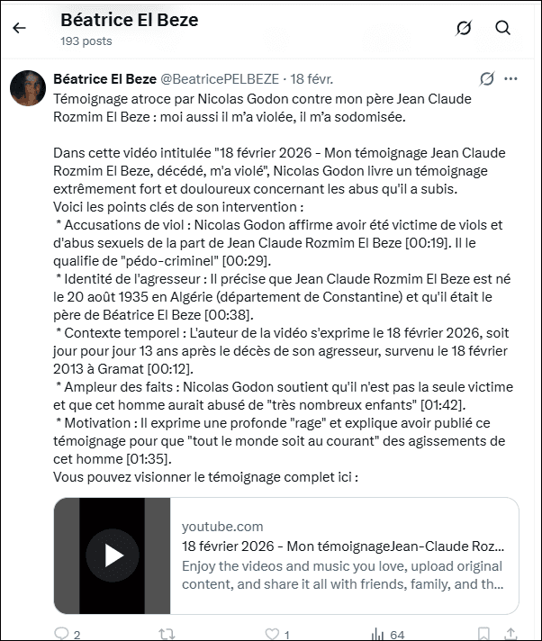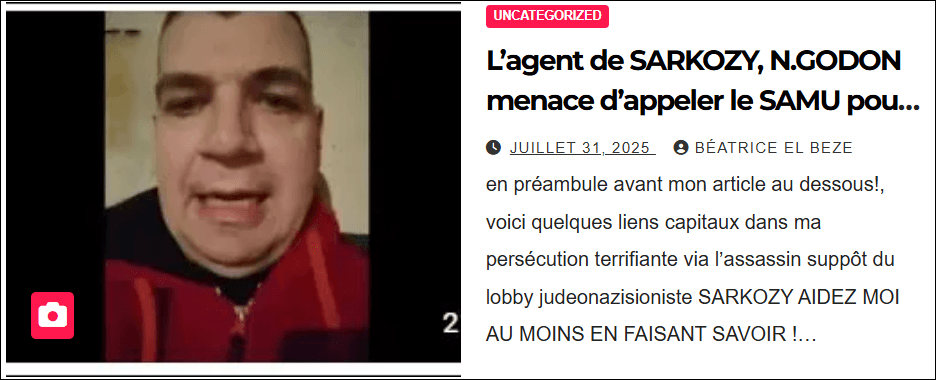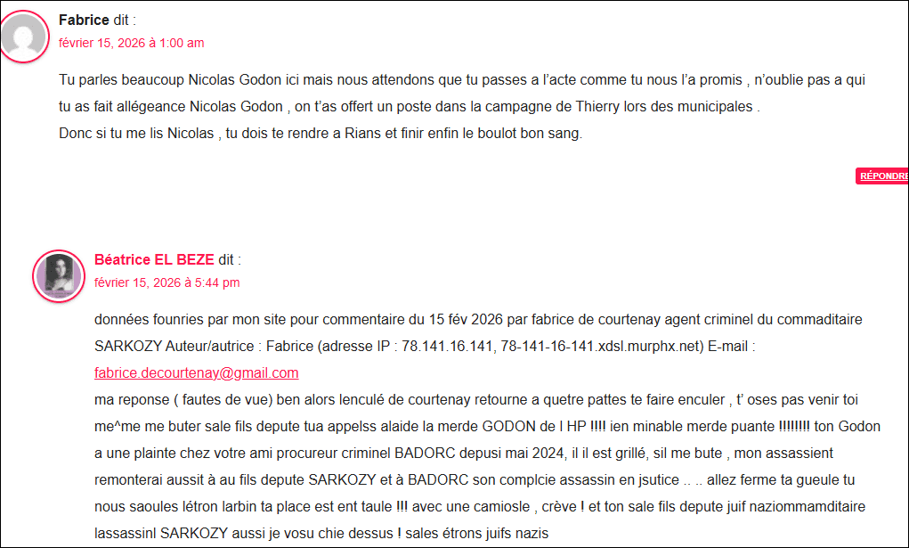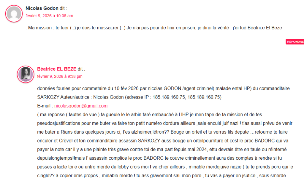 … vidéo plus bas mais que je n’arrive pas à mettre en plus petit format) de dénonciation calomnieuse gravissime contre mon père ( grave victime d elassassin SARKOZY voir preuves dans :ma plainte contre nicolas SARKOZY, du 07 oct 2021 ,) par vidéo le 18 fév 2026 par Nicolas GODON ,malade mental HP schizophrène dangereux , instrumenalisé criminellement via SARKOZY (assassin commanditaire dont ce sont certaines des méthodes nazies ) et couvert en justice comme sebastien Scarpinato, jean claude Cohen, fabrice de Courtenay, simon Zirmi, Willy Vallez etc . en bande organisée criminelle couverte en justice, comme leur commanditaire SARKOZY quelques soient leurs actes, par le procureur TJ Nanterre Yves BADORC qui collabore( comme Pascal PRACHE et laure BECCUAU tjparis) avant lui en bloquant toute enquête criminellement en entente établie avec lassassin SARKOZY malgré plaintes contre SARKOZY et ses agents larbins Ces affirmations de Nicolas GODON sont délirantes et impossibles car mon père homme droit et moral est myopathe en fauteuil roulant depuis très longtemps, n’a jamais connu GODON, vit dans le centre de la France et de plus cette merde criminelle GODON ( voir ma plainte du 22 mai 2024 contre nicolas GODON schizo et la bande organisée criminelle de SARKOZY plainte que BADORC procureur bloquealorsz quelle n’est pas classée sans suite!) pour menaces de mort cycliques (il dit récemment en core (voir caputre écran plus bas) quil va venir me massacrer ici a Rians (avec la bénédiction des ordures juives nazies qui lui ordonnent de me buter depusi 2021 – date de ma première plainte le monstre SARKOZY ! NIcolas GODON est utlisé pour son irresponsablité penale et capable puisque fou, de passer à laction quand le lobby menace de tuer son père si n’obéit pas, comme il a dit en 2024 message audio en témoinge porté »es en justice ( « suis obligé de te tuer pour protéger mon père . ».) via commanditaire SARKOZY