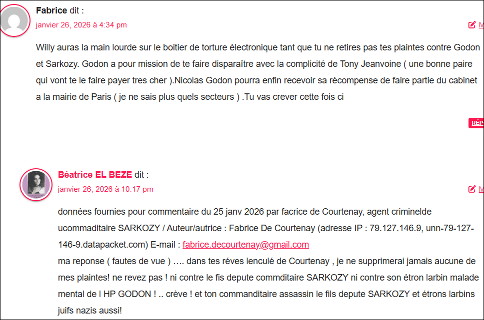 données fournies par mon site pour commentaire du 23 fév 2026 par le pseudo « walet Bougjneah » iventé ce jour, agent criminel juif nazi du commanditaire assassin SARKOZY ( cest sebastien Scapinato ou nicolas Goodn ou fabrice de courtenay etc .. planqué sous ce nouveau pseuod mais avec adresse mail commune depuis 3 jours pour els membres de la bande organisée criminelle de SARKOZY) / Walter Boujenah sa.tests@pm.me adresse IP 79.127.141.14