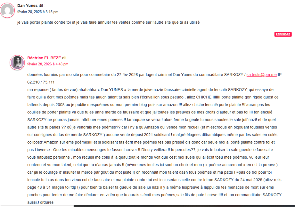 données fournies par mon site pour commentaire du 3 mars 2026 par Auteur/autrice : Jean Claude Cohen agent criminel du commaditiare SARKOZY (adresse IP : 78.243.87.96, pin31-1_migr-78-243-87-96.fbx.proxad.net) E-mail : sa.tests@pm.me