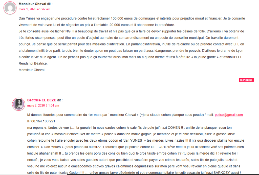 regardez ce jour 1er mars 2026 ce commentaire halliucinant (de connerie aussi) à par la gosse pourriture criminelle juive nazie Jean Claude COHEN ! (NG es tle fils depute GODON qui salit actuellemetn très gravemetn mon père( là en coe s commanditaire lassassin SARKOZY , les agets de SARKOZY nétant que des étrons larbins sans pouvoir de décision
