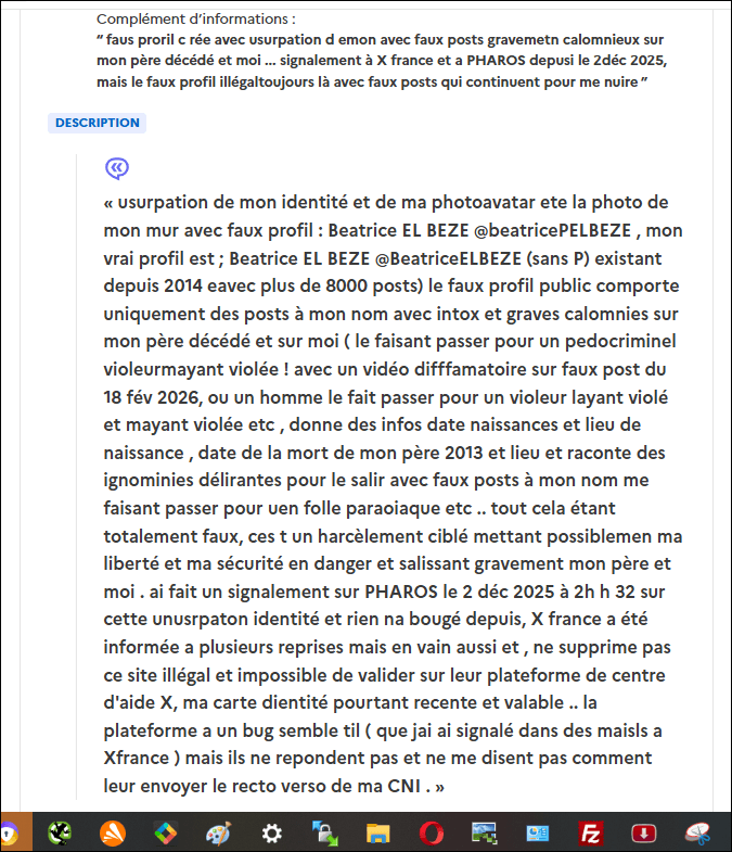 voir preuves cidessous que ma plainte en ligne du 22 fév 2026 téléchargée ci dessous telle qu’envoyée ne comporte strictement aucun propos « lunaire et détaché de la realité » !!!