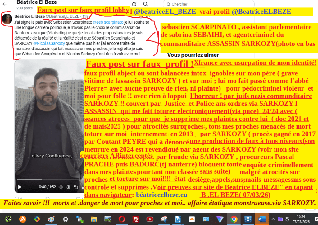 je vais redéposer ma plainte pour usurpation grave de mon identité (même si le procureur BADORC va criminellement la cacher sans la traiter?? on verra !..) contre ce faux profil Xfrance (adresse actuelle @BeatriceEL-BEZE) avec faus posts gravement dégueulasses mais ne vais pas le faire par plainte en ligne (qui ai je appris depuis, ne peut pas être déposée en ligne pour usurpation identité) Lassassin SARKOZY et ses étrons larbins tiennent a leur faux profil couvert par Police et Justice pour continuer à balancer leurs sales intox pour réécrire uen fiction délirante et me sair et salir mon père dans lopinion pubique, comme ils font aussi avec labbé Pierre ! !!! et c’est avec leurs diffamations que ces agents criminels de SARKOZY commaditaire avec complicité de la Police de nanterree t de de Pharos ,et de Xfrance, veulent me faire passer pour folle à nouveau via le cinglé assassin commanditaire SARKOZY ! mais c’est ce qu’on va voir!… car je veux bien qu’on se foute de ma gueule mais il y a des limites ! Nier une usurpation identité aussi grave et prouvée, est dément ! et le comble Les méthodes criminelles de cette Police Nanterre je les connais par coeur, ainsi .