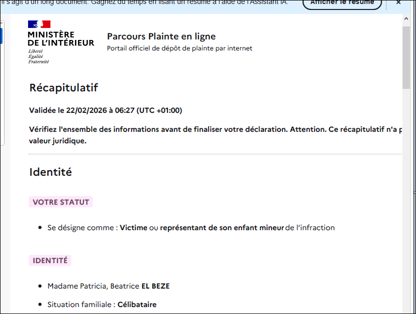 voici ci dessous le contenu de ma plainte en ligne du 22 fév 2026 pour preuves de la diffamation délibérée par la Police Nanterre, mafia criminelle depuis au moins 2004 !