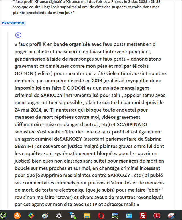 plaintes gravissimes !ma plainte du 14 nov 2023 , et voir ma plainte du 22 mai 2024 contre nicolas GODON schizo et la bande organisée criminelle de SARKOZY qui l’instrumente pour qu il me passer pour folle en vidéos ert me tue