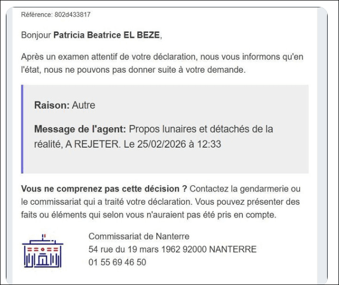 Police aux ordres du lobby juif nazi et de son suppot le déchet cinglé criminel SARKOZY qui m’a faite embarquer menottée devant un psychiatre et menacée d’internement dès 2004 avec rien à lappui ! pour me faire taire dans mon affaire , internement avec uniquement des faux en 2013! ( voir docs preuves procès gagné contre l’Etat ( en fait par SARKOZY), par COUTANT PEYRE) .. et maintenant plainte en ligne pour usurpation identité du 22 fév 2026), suite à laquelle ai reçu ce message débile avec inepties calominieuses par commissariat criminaliisé paré SARKOZY ! – et qui a donc traité illégalement ma plainte sans y être habilité pour continuer comme à leur habitude depuis 2004(= 22 ans de saloperies! et faux témoignages ( voir preuves ici : :ma plainte contre nicolas SARKOZY, du 07 oct 2021 , .