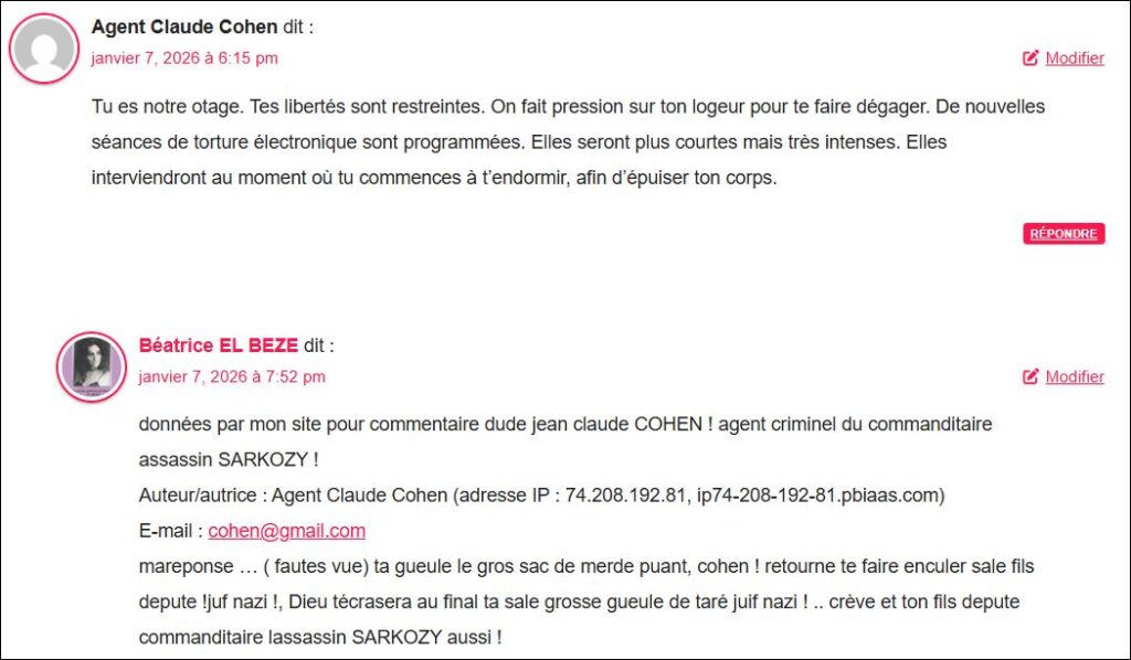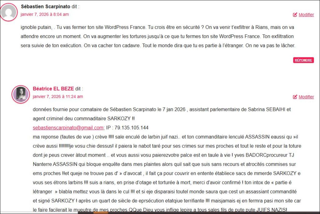 MON MEURTRE EN COURS PAR LES FILS DEPUTE JUIFS NAZIS ( Que Dieu leur inflige le pire) en france au vu et su de tous !! et dans grandes souffrances !! par torture électronique atroce tout ce jour 7 janv 2026 depuis minuit par seances atroces !! (commanditaire lefdp assassin SARKOZY )!!!! , par microsecousses qui bloquent la respiration et provoquent douleurs horribles partout dans le dos (car colonne vertebrale microsecouée non stop) + , stridences électronqiues puissantes qui privent de sommeil et sont atroces a subir avec maux de tête horribles + bruléee vive ! pa rmicroondes les gens doivent savoir ! ces sévices et torture atroces sont infigés de fait avec la bénédicion du procureur criminel du TJ Nanterrre le vendu au lobby juif nazi! Yves BADORC qui bloque toute enquete malgré les preuves, pour laisser tous ces etrons juifs nazis libres de torturer de massacrer; de terroriser, de faire des faux de partout etc. impunément …La place du criminel BADORC est en taule comme celle de l’assassin commanditaire SARKOZY et de ses larbin ! ne suis pas partie à létranger et nai aucun projet de partir ni aucun endroit où aller susi seule isolée , en prise d’otage criminelle à Rians et état de siège par l’assasin SARKOZY !!! mes proches sont en France ! tous menacés de mort et certains, les plus chers, déjà , victimes d’atrocités via le monstre SARKOZY !!!! donc hors de question que je ferme ou supprime quoi que ce soit … et si je meurs ou disparais, les gens sauront vite qu’on ma assassinée à Rians et qu’on a caché mon corps pour que lenculé SARKOZY ne sois pas supecté d’assassinat (voir capture de ce jour) mais ça ne marchera pas , tout el monde sait qu ‘il veut me buter et que cest lui mon assassin (en cours déjà par toturre electronique en meurtre lent quil accélère.. ou autre scénario) !!!! pour que ej ferme mon site (où sont pubiées me plaintes contre ce monstre et les preuves!! donc je ne fermerai pas mon site pluto crever ! car m invibliser ce serait faciliter le meurtre de mes proches par ce fils depute cet étron puant SARKOZY qui relève de la taule à vie au moins !!! on devrait avoir le droit de buter direct ce monstre qui torture massacre et tue avec des faux médicaux ou autrement !! cet étron a tué et torturé sans doute aussi , plein s de gens !! YvesBADORC procureur criminel qui bloque mes plaintes (non classées dans suite), complice de lhorreuret dela torture! en attendant que ej crève et que le monstre assassin SARKOZY fasse eliminer d’autres de mes proches témoins genants voic les commentaires des tarés juifs nazis qui me harcèlent non stop à plusieurs tous les jours. terrroisme d’Etat et orutre avec la bénédicion du procureur collabo criminel Yves BADORC qu n’informe pas la Police (collabo aussi , persécution étatique),comme il est tenu de le faire !