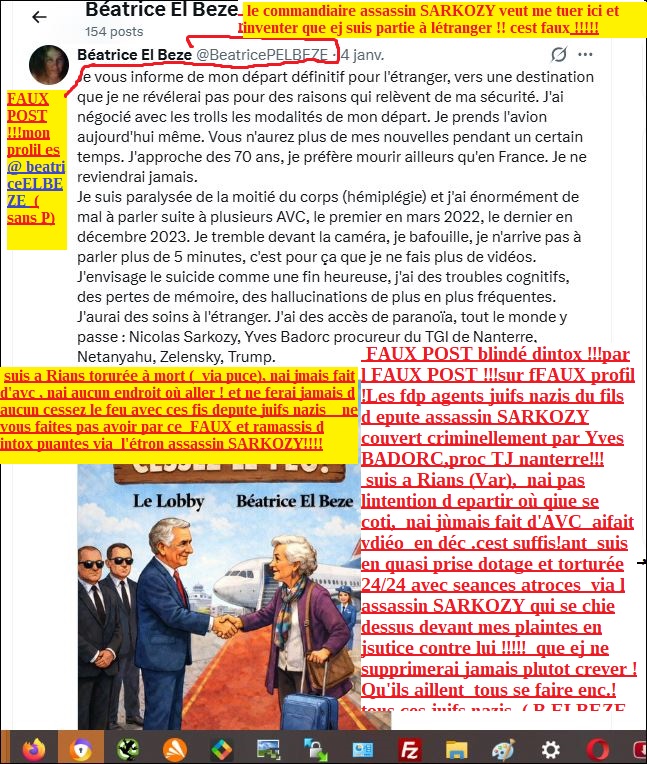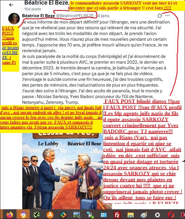 2026. URGENT !!! …….( fautes de vue ) Le fdp SARKOZY se chie dessus face à mes plaintes !!!!… ATTENTION FAUX POST de ce jour 6 janv 2026 sur faux profil Xfrance : @beatricePELBEZE via l’assassin SARKOZY! sale FDP juif nazi !!! pour me buter et pour qu’il ny ait « pas de corps ! pas de crime »!!! ce vieil étron criminel SARKOZY, fait faire des faux en veux tu en voilà (voir larticle avec preuves » Les faux via lassassin commanditaire SARKOZY.. » sur mon site de beatrice EL BEZEé !!! ) par ses étrons larbins juifs nazis (scarpinato, GODON ,et autres merdes pour faire croire un que jai fait un cessez le feu! ( quils aillent se faire enc… il n’ y a pas plus de cessez le feu que de beurre en branches! ,(ai déjà fait une vidéo en déc 2025 pour démentir les intox puantes des étrons larbins de SARKOZY et montrer que jai aucune paralysie faciale du coté gauche comme ils ont écrit balaba etc mais, je ne vais pas passer mon temps pas à en refaire d’autant que l’ importation de vidéo est bloquée sur ma page depuis fin déc 2025 !!!et ne suis pas aux ordres de ces fils depute « !) faire croire que ej vais partir à l’étranger (on se demande bien où car lassassin SARKOZY a fait faire main basse et volé on logement au Maroc et massacré ma relation affective depusi 26 ans Abdesslam AATILLAH devenu totelement de puis oc 2024 injoignable et déclaré mort à nouveau en nov 2025 par ces sacs de merde agents de létron SARKOZY , faire croire que eje suis suicidaire( je en le le suis abolument et ne lai jamais été ( ces fils depute juifs nazis ils font ce faux cycliquement (or ne suis pas du tout suicidaier ils sont en panique els juifs nazis et pressés maintenant et tentent toutes les intox pour me buter sur ordres de leur fdp commanditaire létron SARKOZY ASSASSIN ASSASSIN !!!!! le fdp SARKOZY va se mettre ses intox dans son vieux cul d’assassin Suis a Rians en quasi prise d’otage, 4 au moins de ems proches vicitmes d’atrocités via cette pouriture SARKOZY (voir plainte du 24 mai 2025 contre el fils depute SARKOZY) tous mes autres menacés tous de mort , donc pas question que je supprime mes plaintes,pour faliciter nos meurtres en plus ! Qu’il aille se faire » enc… » le vieux nabot assassin tortionnaire plutot crever que de négocier quoi que ce soit avec ce et ces , « paquets de merde » juifs nazis !!!! Que Dieu leur inflige le pire ! et que Dieu soccupe aussi de leurs sales collabos criminels tel el proc du TJ nanterre Yves BADORC qui cache soigneusement mes plaintes en attendant qu on crève mes proches témoins genants et moi )