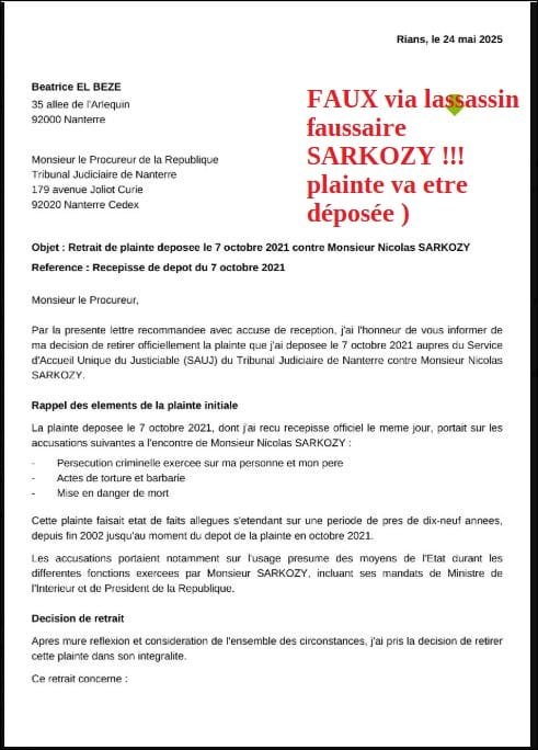 SARKOZY a fait intercepter et remplacer ma plainte terrible du 24 mai 2025 contre lui par un FAUX très en justice à mon nom disant que je demande la suppression de ma 1ère plainte contre lui d’oct 2021 !! je vais porter plainte en urgence malgré les menaces de mort , la pourriture SARKOZY la dans le fion car ai fait courrier (que je vais mettre en ligne) de démenti ,dénoncé le faux et demandé comme c’est mon droit faux ou pas, le maintien de ma plainte. le Proc Nanterre n’a pas le choix il doit maintenir ou reactiver ma plainte s’il la supprimée , c’est la loi .