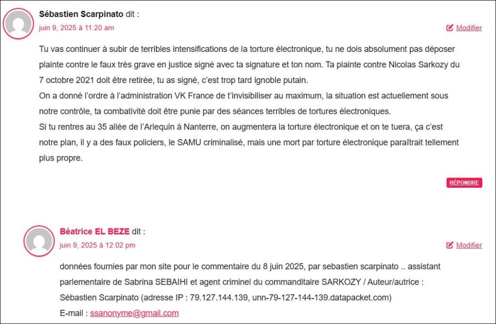 données fournies par mon site pour le commentaire du 8 juin 2025, par sebastien scarpinato .. assistant parlementaire de Sabrina SEBAIHI et agent criminel du commanditaire SARKOZY / Auteur/autrice : Sébastien Scarpinato (adresse IP : 2404:f780:8:3137::16, 2404:f780:8:3137::16)
