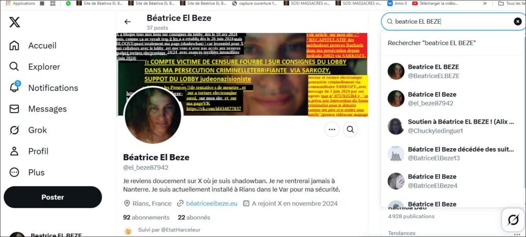 ci dessous faux profil, avec usurpation et copie de mon mur de mon vrai profil Xfrance et de ma photo avatar et sur la droite on voit quil y a 2 comptes, le mien@ beatriceEL BEZE et le faux profil par lobby @el_beze97942, mais ces dp agents de SARKOZY ont commis l’erreur, tellement ils sont cons, de publier leur fausse lettre dès le 6 juin 2025 mais sur leur faux profil avec usurpation de mon identité et de ma photo avatar!!! et leurs faux posts pourris faits avec usurpation de mon identité ( faux profil X que je n’arrive à faire supprimer par X france réseau pourri collabo du lobby ) de plus, cerise sur le gateau ce faux profil a bloqué mon vrai profil depuis longtemps pour m’empêcher de commentter les faux posts à mo nom (voir la capture ci dessous ;