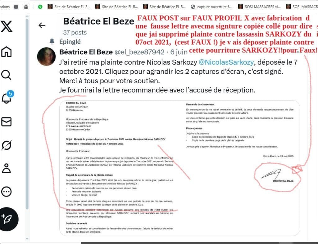 2/ ai appelé les services du procureur ce matin 10 juin 2025.. Yves BADORC ! lai vérifié que ma plainte du 24 mai 2025 est (m’a ton dit) t bel et bien arrivée en AR au TGI Nanterre , avec ses 55 pages et avec sa clef USB . La seconde personne(qui ne s’est pas présentée..?) qu’on ma passée au télephone en appelant ce matin , m’a dit quelle notait que je confirmais le maintien de ma première plainte d’oct 2021 contre N.SARKOZY , objet (je lui ai expliqué) le coup de la fausse lettre mon nom depuis le 6 juin 2025, exhibée sur faux profil à mon nom aussi avec fausse signature à mon nom par les agents de SARKOZY datée du 24 mai 2025, pour raconter que je demandais la suppression de cette 1ère plainte d’oct 2021 contre SARKOZY voir preuve du faux ici: (https://x.com/el_beze87942/status/1930851852297416908) Je n’ai pas bien compris si le faux( via agents de SARKOZY avait été ajouté ou pas dans mon envoi ni si linterception de mon envoi AR avait eu lieu réellement ou pas, mais cette personne( la secrétaire ( du service du procureur semble til) m »a précisé qu’elle notait que je demandais le maintien de ma 1ère plainte d’oct 2021 contre N. SARKOZY et que je la maintenais pour la sécurité de mes proches malgré et à cause du chantage criminel sur tous mes proches .Mes deux plaintes contre N.SARKOZY sont donc a priori aux mains du procureur de Nanterre et en piste toutes les deux à ce jour d’après cette seconde personne du service du procureur semble til (elle ne s’est pas présentée) qu’on m’a passée au tél cematin après que j’ai eu une première personne en appelant) et elle m »a confirmé, suite ma question, quil n’était pas nécessaire que je fasse un dépôt de plainte pour faux et usage de faux …et elle m’ a dit que jallais recevoir le retour AR de mon envoi . . elle m’a demandé aussi où j’étais actuellement .. je vais rester en contact et vérifier tout ça car tout est purement oral ce matin .et n’ai aucune preuve des dires de cette personne du tribunal et n ai pas son nom, donc aucune preuve de rien .. B.E’10 juin 2025)
