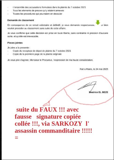 cliquer sur) la plainte doct 2021 contre nicolas SARKOZY est ici : et voici (cliquer sur) ma seconde plainte terrible aussi du 24 mai 2025 contre nicolas SARKOZY, 55 page + clef USB scotchée sur la 1ère page, remplacées par cette fausse lettre avec fausse signature ci dessus mise après interception frauduleuse dans mon envoi AR du 2 juin 2025 par les agents de SARKOZY,