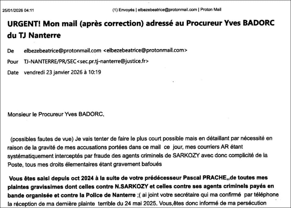 Voir plus bas l’entier de mon mail scannerisé du 23 janv 2026 à Yves BADORC procureur TJ NANTERRE, cidessous avec les captures de commentaires avec IP et adresses mails qui y ont été insérées pour preuves avant envoi .