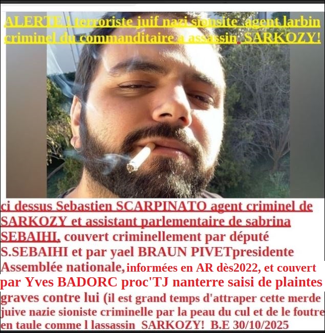 Sebastien (Colombo) SCARPINATO , assistant parlementaire de Sabrina SEBAIHI et agent c criminel terroriste de SARKOZY, est couvert criminellement en justice par les procureurs P PRACHE puis Yves. BADORC, collabos du lobby juif nazi sioniste, malgré plaintes graves et nombreuses contre lui, voir documents récepissés plus bas