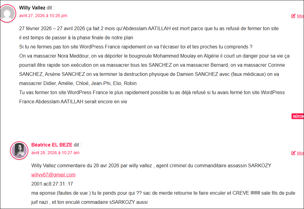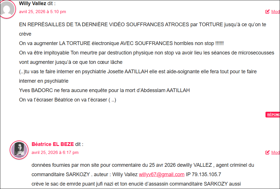» 28 avr 2026……16 h . 52 . ( fautes de vue ) !MESSAGE URGENT AUX INTERNAUTES ! microsecousses non stop !!! par torture elctronique douleurs partout dans le dos dificulté a respirer pà cause les mcirosecousses depuis des heures!!!!!! s!!!!!!!!!! impossiblité de se reposer et de rester allongée ou assise! à cause des microsecousses incessantes , la destruction est la m^me quelque soit lintensité ses microsecousses METHODES DE BARBARIE NAZIE DE L’ ENCULÉ sSARKOZY ej vais en crever dans peu de temps sils narrtêent pas , totlement …mon corps est a bout .. je ne supplie personne je previens ! cest tout . mo orrganisme épuisé par el manque d esommeil et les souffrances est au bout de ce suil peut subir , ne suis i pas toute jeune loin de là et mon coeur peut lacher à tout moment !!!! mais je veux q uon retienne que je jchie toujours sur ces merdes juives nazies ces fils depute assasins et sur leur enculé commanditaire létron puant , l’ assassin SARKOZY !!!!!! la vielle merde juive nazie a peur il se chie dessus de peur que ej porte plainte cette fosis pour meurtre conte lui pour son assasina horrible de mon compagnon Abdesslam AATILLAH …. QUE DIIEU LES EXTERMINE CES MERDES JUIVES NAZIES !!!!!!!!!!! ET LEURS ORDRES QUILS SE LES METTENT TOUS DANS LE CUL BIEN PROFONDEMENT lenculé a chosi le meurtre par torture à distance via puce en merde lache et sans honneur quil est !!, ,après tous ses assassinats entre autres celui d e mon père juif, jean claude Rahmim EL BEZE massacré dès 2007 par lenculé SARKOZY commanditaire et lassassiant demon compagnon musulman Abdesslam AATILLAH 59 ans mon compagnon depusi 27 ans , massacré par le même enculé lache commanditaire SARKOZY !!; mon père et Abdesslam tosu les deux parce qu ils maidaient !!!!!!!!!!!!! mise amort par destrucion physique torture t bruléee vive par mcioondes après 25 ans d’atroce prsécution avec la sle collaboraion criminelel monstreuse dela Police et d ela Justice ( pourriures de procrureurs !) yves BADORC complcie assassin relève d ela pien d emort lui aussi pour complicité faite sciemment pour faciliter sciemment l’assassinat horrible d’abdesslam AATILLAH , après uen peremièe itentative de meurtre dénoncée par plainte le 24 mais 2025 pdotn ilétais saisi ! et qu’il a bloquéee! (mais pas classée sans suite ) maquant à tous ses devoirs de procureur en tel contexte criminel prouvé !!etc ) …………..SARKOZY fils d epute! vas y bute moi !!! tu seras mon assassin que j’ insulte et dénonce jusqu’au bout avec courage après une persécution terrifante d’un quart de siècle ‘avec tentaives de meurtres sur moi et mon père et mon compagnon assassinés§ sur tes ordres sale fils de pute !!!!!!!! c’est ce qui restera dans l’histoire tu n »es qu ‘ une minable merde un sale fils dpute juif nazi médiocre en tout inintelligent symbole de bassesse a tous niveaux , une merde lache et traitre à dégueuler et que quais tout le monde vomit et reve de voir crever sauf eles lobotomisés !! !!!!!!! et c »est ce qui restera dans l’histoire , que je te crache a la gueule juquau bout et te dénonce jusquau bout ale fils de pute » VA TE FAIRE ENCULER SARKOZY !!!! ET CREVE !!! TES ORDRES JE MEN BRANLE !! MEME SI JE CREVE JAI AGI C EN CONSCIENCE CAR SE TAIRE FACE A L ‘HORREUR EST TOUJOURS LE PIRE !! …. TU VAS PAYER POUR CHAQUE SECONDE DE SOUFFRANCE ET POUR CHAQCUN DE TES MEUrTRES !!! ! ton nom veut dire textuellement » « le tas de merde » en argot hongrois ça te va si bien minable enculé !!!! mon nom EL BEZE ( de EL BAZ) celui de mon père veut dire « le faucon » alors tes ordres mets oi les dans ton vieux cul d’assassin , moi beatrice EL BEZE fille demon père je ne te respecte pas , jt e chie dessus létron juif nazi !! et et si ej pouvais j’écraserais ta sale gueule de rmonstre à mains nues!! tu mérites la peine de mort( quil faudrait rétablir) pour tous tes crimes et torture et tous tes faxu médciaus et en tosu genre s !!!!!!!!! mais rassure toi létron, je sais que Dieu le fera mieux que moi, sois patient fisl depute soi spatient ta fin arrive ….! et pour tes étrons larbins aussi !!!!!!!… !!!! je te refais un doigt dhonneur le fils depute assassin tortionnaire SARKOZY !! .. car jamais une merde comme toi ne me fera obéir pluot crever !!!!!!!!!!! e Dieu va te faire payer tes crimes au prix fort !!!!!! dont celui de mon courageux père d e mon courageux compagnon Abdesslam .. t toi ! crève !lenculé SARKOZY la merde lache sans honneur sans courage ,sans humanité, le minable enculé sois maudit et pour toi lenfer pour léternité !! SALE JUIF NAZI !!!!!!!!! !!