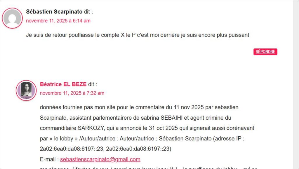 1. données fournies par mon site pour commentaire du 8 dé 2025 par sebastien SCARPINATO , assistant parlementaire de Sabrina SEBAIHI et agent criminel du commanditaire SARKOZY / Auteur/autrice : Sébastien Scarpinato (adresse IP : 23.234.81.193, static-23-234-81-193.cust.tzulo.com)