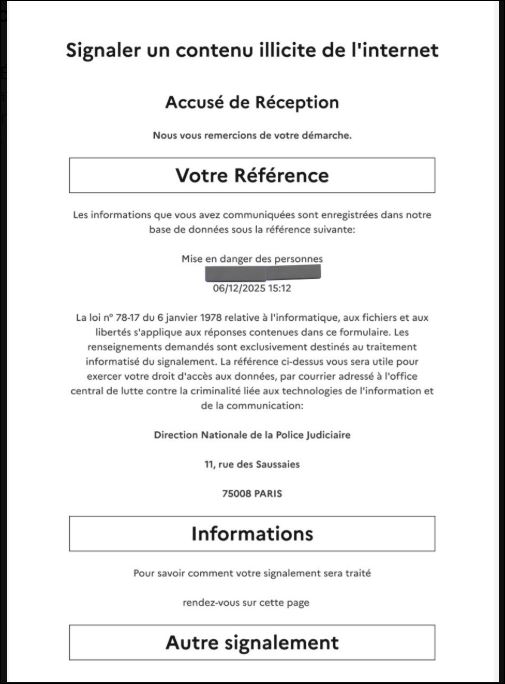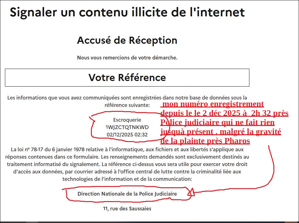 FAUX SIGNALEMENT PHAROS LE 6 déc 2025 VIA (agents criminelsde) SARKOZY COMMANDITAIRE!!! (après mon signalement pharos fait le 2 déc 2025 (le voir plus bas)