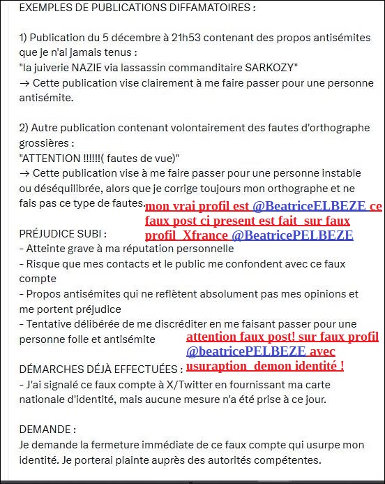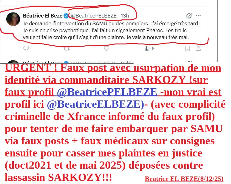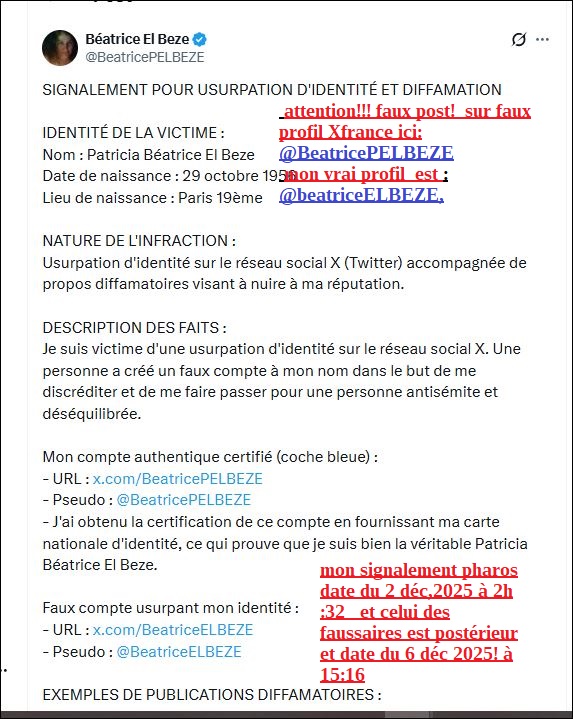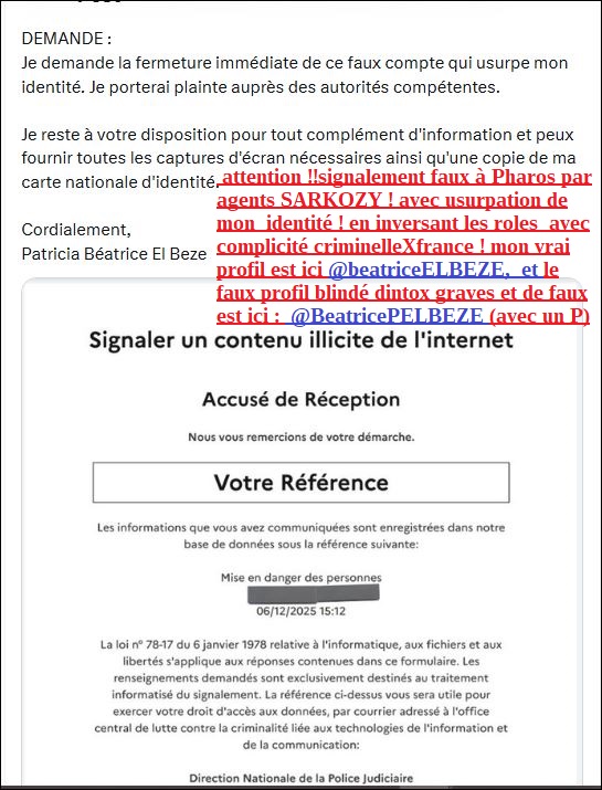 puis ci dessous le 6 déc 2025 (4 jours après après le mien) faux signalement Pharos via agents criminels de SARKOZY du faux profil @BeatricePELBEZE, numéro enregistrement caché … avec faux post débile au dessous