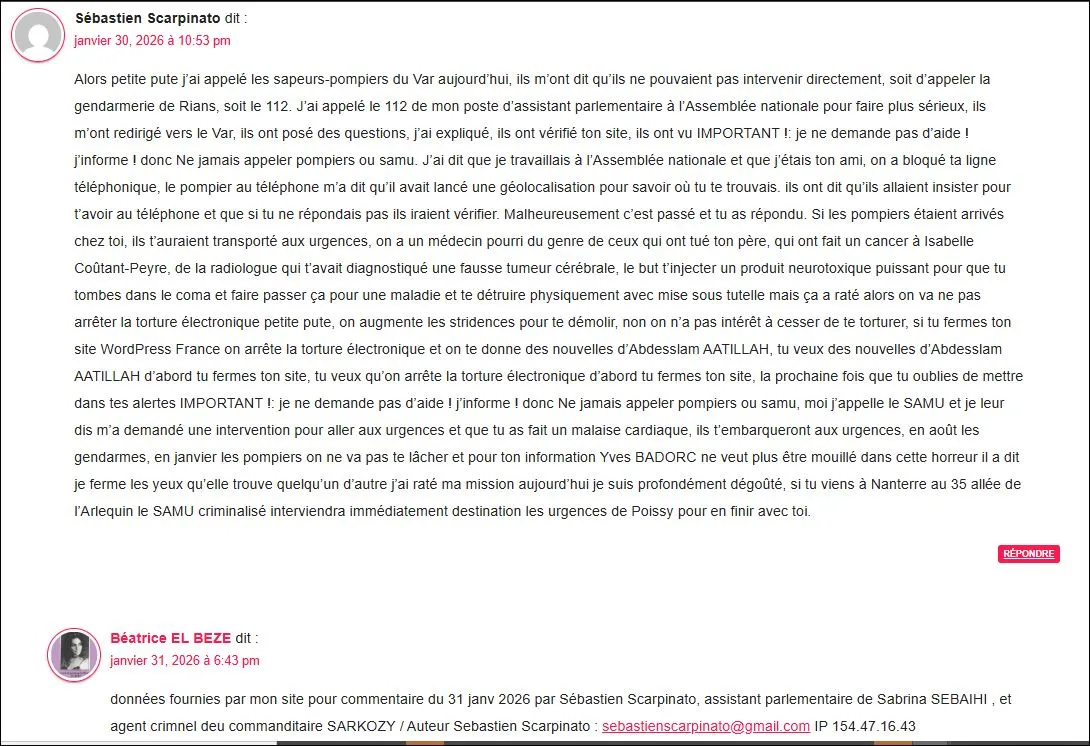 extrait commentaire de scarpnao du 30 janvier 2026 » j’ai appelé les pompier s du VAr aujourdhui (.. ) si les pompiers étaient arrivés chez toi., ils tauraient transporté aux urgences .. le but :t’ injecter un neurtoxique puissant pour que tu tombes dans le coma et faire passer ça pour une maladie et te détruire phyquement avec mise sous tutelle ..(…)