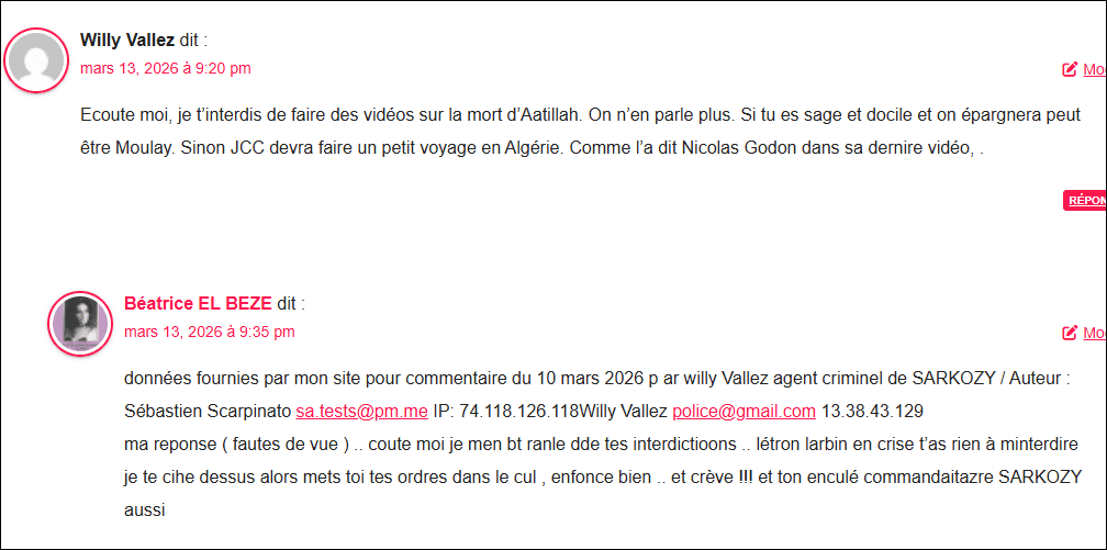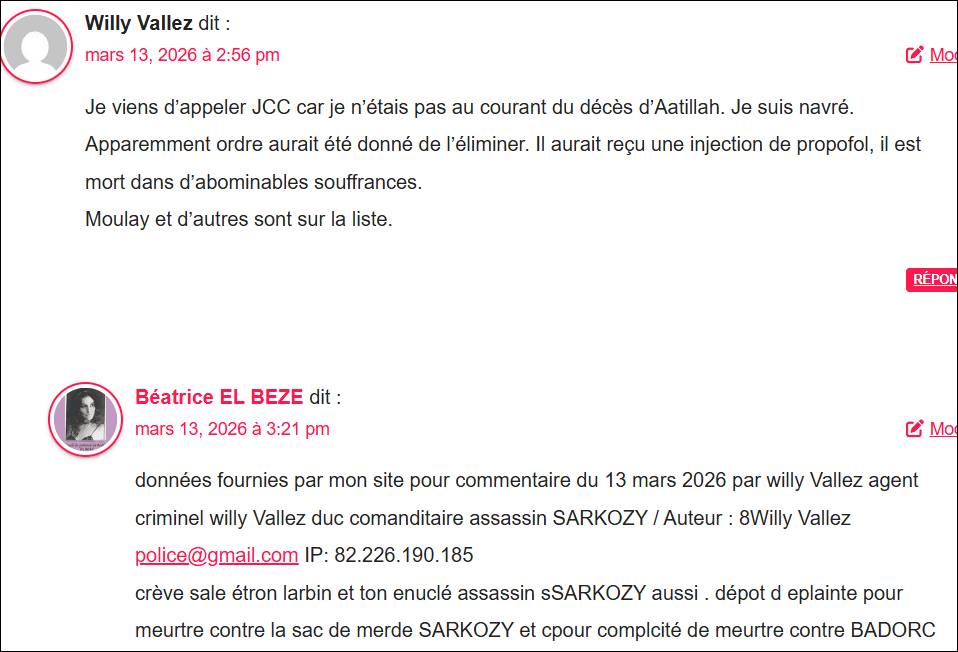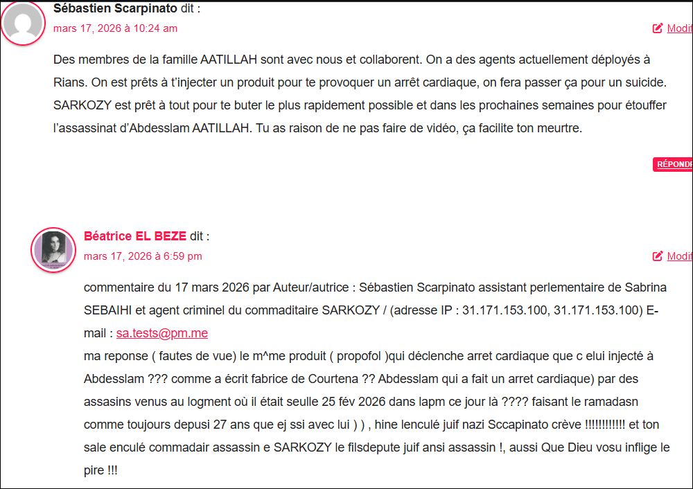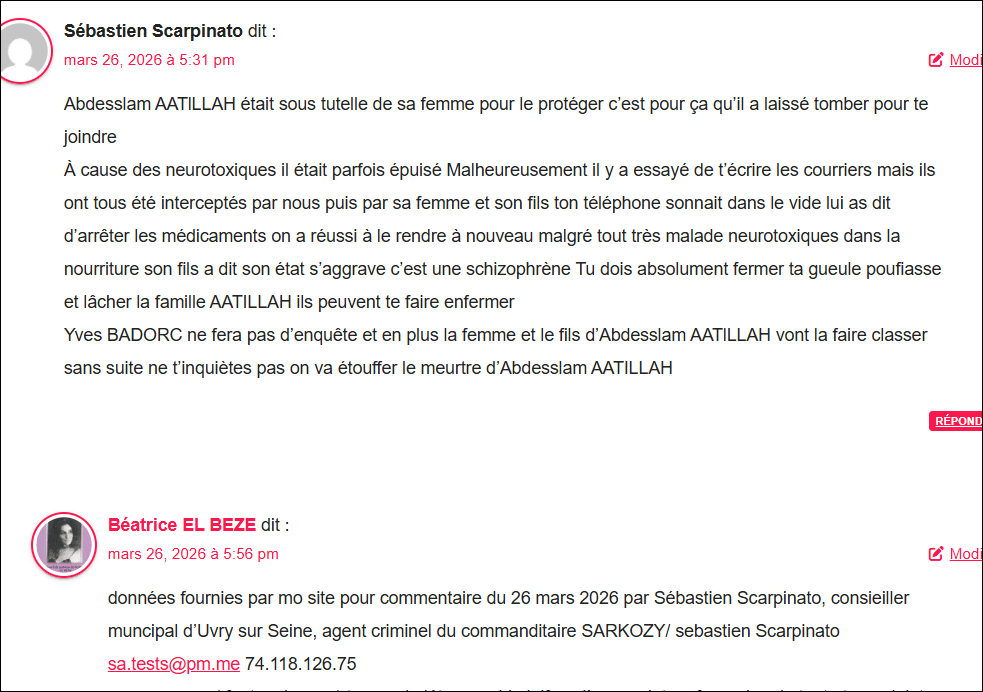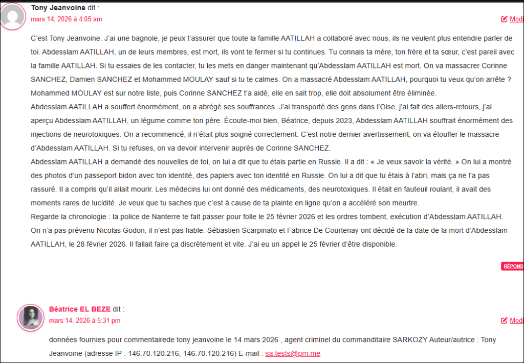 ‘ extrait commentaire du 14 mars 2026 par sebastien agent criminel de SARKOZY couvert criminellemet par rpocureur BADORC TJ Nanterre malgré plainte graves contre lui : (…)… on a massacré l’homme que tu aimais et on va continuer a massacré tous tes proches tu vas fermer ta gueule sur le décès d’Abdesslam AATILLAH . «