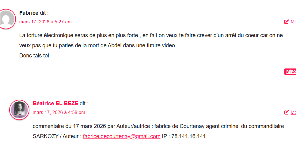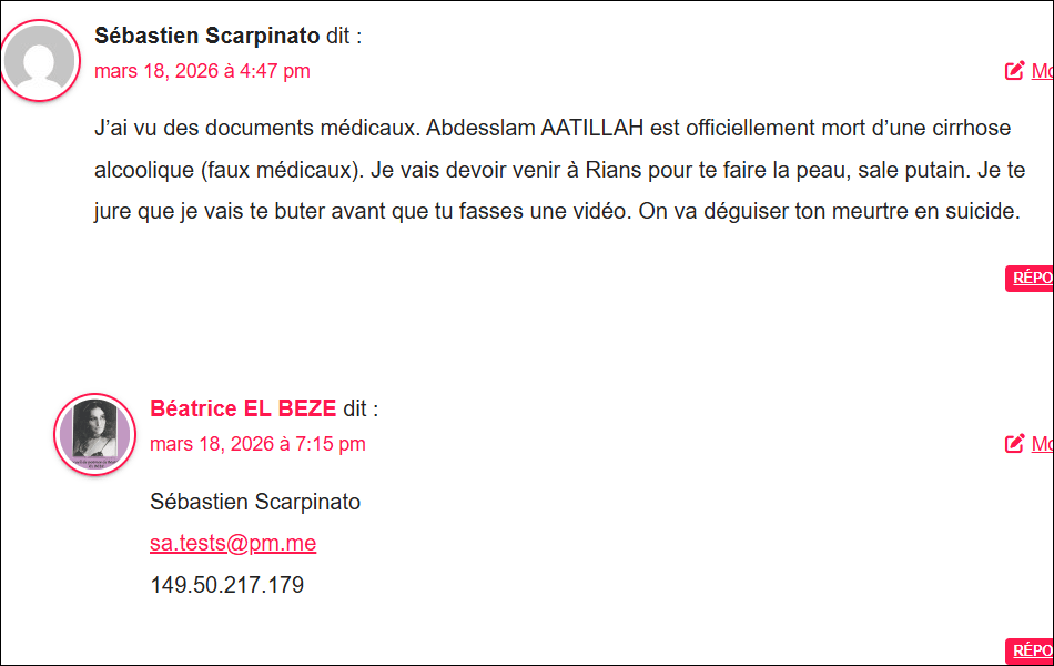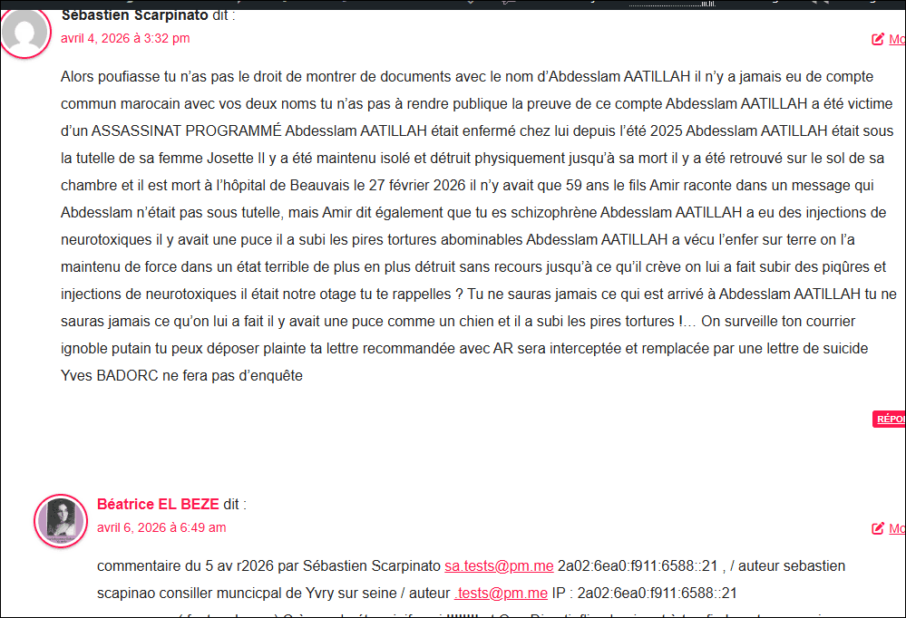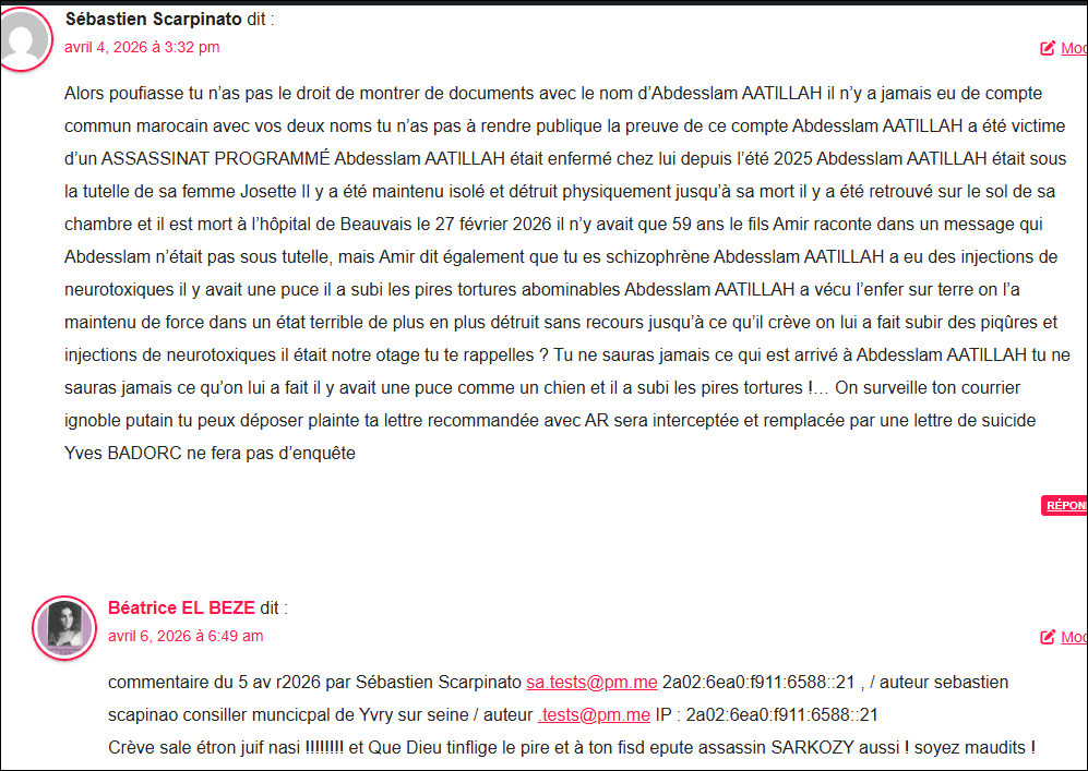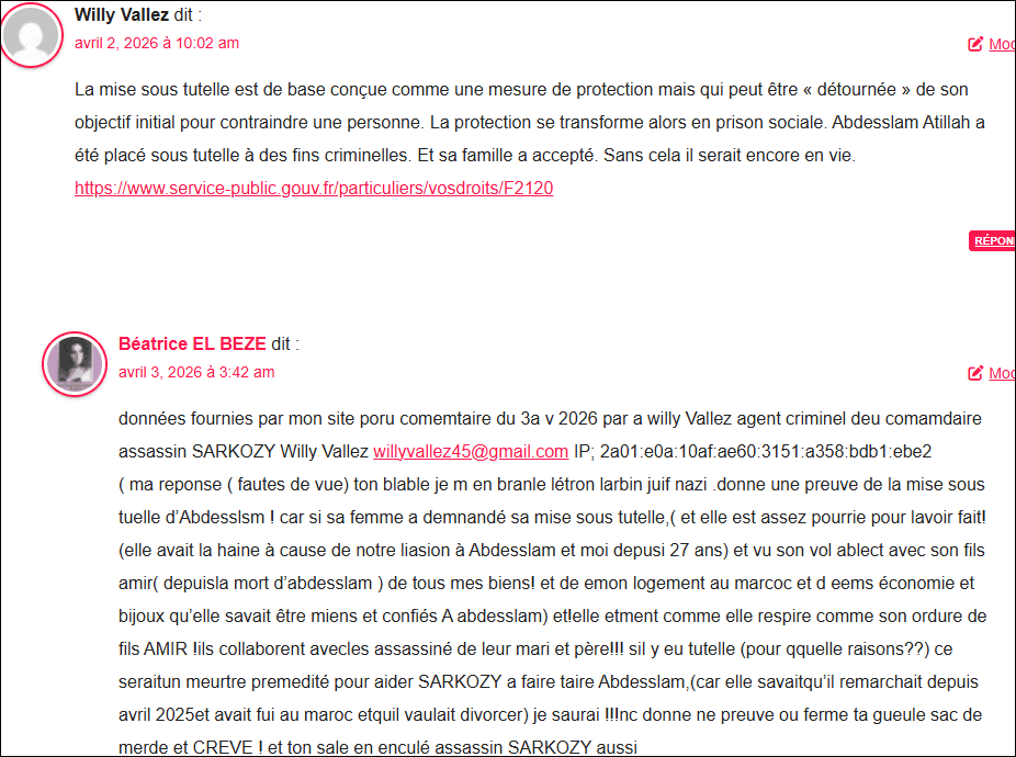 ‘ extrait commentaire du 14 mars 2026 par sebastien agent criminel de SARKOZY couvert criminellemet par rpocureur BADORC TJ Nanterre malgré plainte graves contre lui : (…)… on a massacré l’homme que tu aimais et on va continuer a massacré tous tes proches tu vas fermer ta gueule sur le décès d’Abdesslam AATILLAH . «