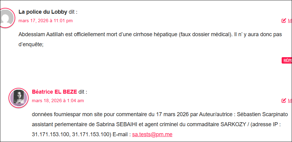 données fourniespar mon site pour commentaire du 18 mars 2026 par Auteur/autrice : Sébastien Scarpinato assistant perlementaire de Sabrina SEBAIHI et agent criminel du commaditaire SARKOZY / (adresse IP : 31.171.153.100, 31.171.153.100) E-mail : sa.tests@pm.me