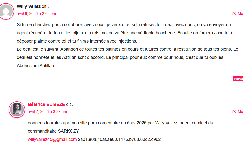 données fournies apr mon site poru comentaire du 6 av 2026 par Willy Vallez, agent criminel du commanditaire SARKOZY