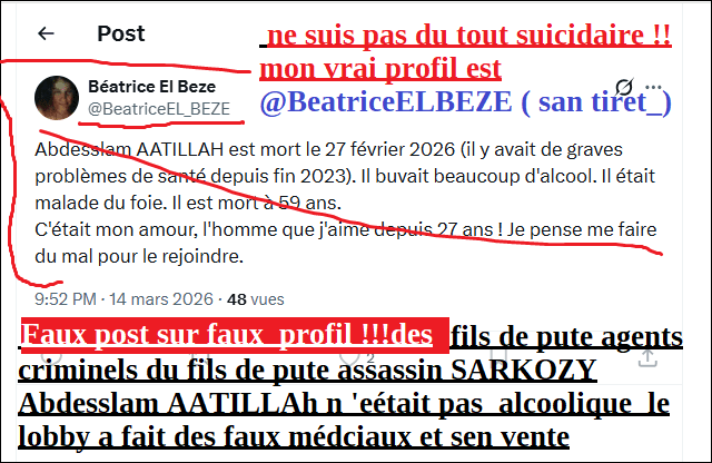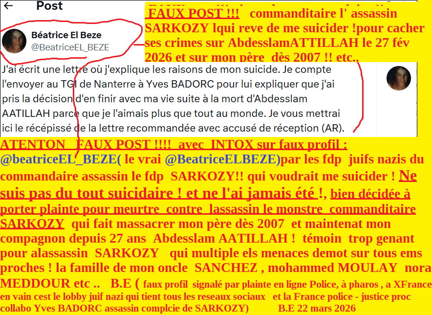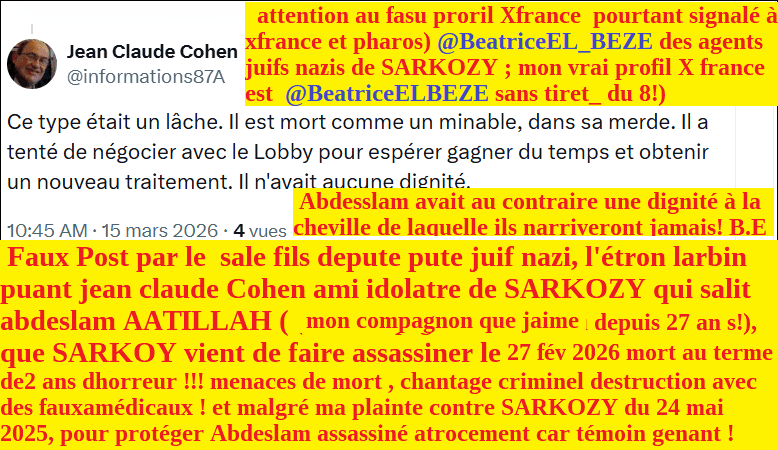 URGENT! SARKOZY A FAIT ASSASSINER Abdesslam AATILLAH (mon amour depuis 27 ans..)mort le 27 fév 2026! après 2 ans d’horreur avec complicité criminelle d’ Y. BADORC proc nanterre! le lobby multiple menaces de mort sur moi et proches pour que je me taise sur la mort d’Abdesslam (hors de question !)!commentaire du 14 mars 2026 de Sebastien Scarpinato, agent criminel de SARKOZY et assistant parlementaire de sabrina SEBAIHI ATTENTION Intox ci dessus par els fisl depute juifs nazis lassassin SARKOZY , ATTENTION a L INTOX capture ci dessous NE SUIS PAS DU TOUT SUICIDAIRE !!!!NE LAI JAMAIS ÉTÉ! même si jai terriblement mal et ces normel , de lassassinat d’Abdesslam; mon compagnon Suis plus déterminée que jamais afaire savoir les crimes de ce sac de merde à enfermer d’urgence a vie LE JUIF NAZI ASSASSIN SARKOZY, puisque la peine de mort malheureusement n’existe plus pour ce genre de monstre criminel!