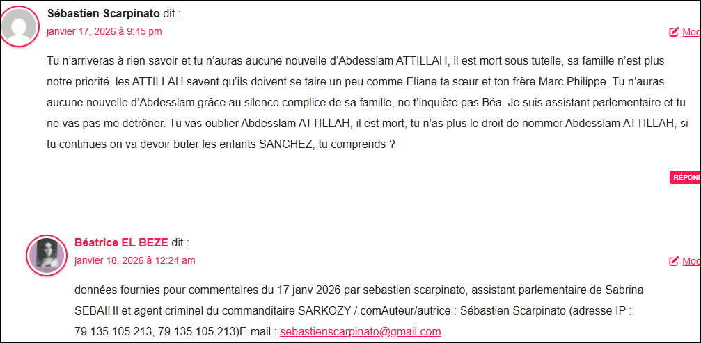 données fournies pour commetaire du 22 marts 2026 par sebastien Scarpinato assistat parlemantaire de sabrina SEBAIHI et agent criminel du comandaire d SARKOZY / / Auteur/autrice : Jean Claude Cohen (adresse IP : 159.26.104.31, 159.26.104.31) E-mail : sa.tests@pm.me