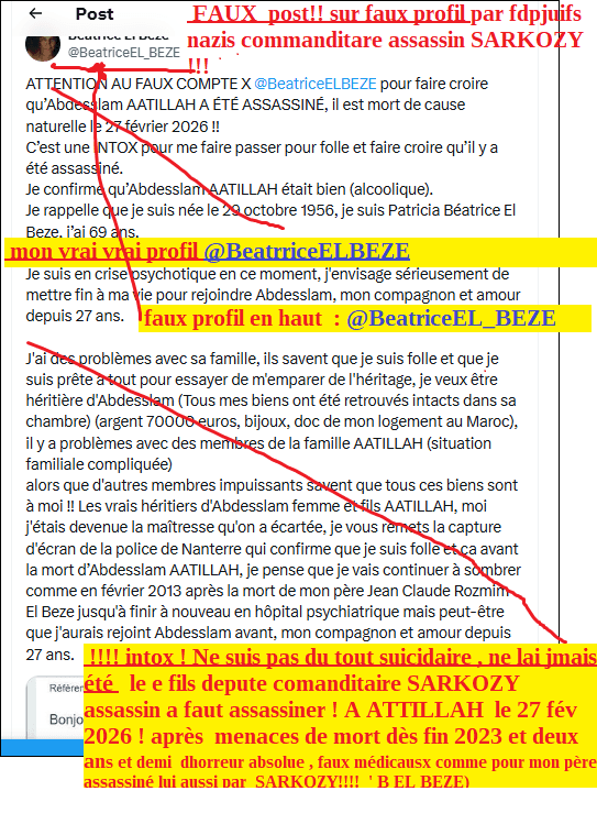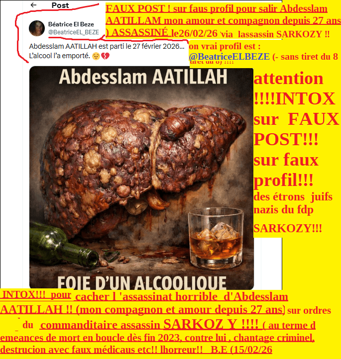 LIRE larticle en entier (meme s’il y a des redites car écrit direct en plusieurs fois pour que la vérité soit dite !!! car abdesslam AATILLAH 59 ans dans la pliane force de lâge , encore jeune, l’homme que jaime depuis 27 ans, mon compagnon EST MORT ASSASSINÉ HORRIBLEMENT VIA LE COMMANDITAIRE JUIF NAZI SARKOZY !!! le 27 fév 2026!! = ces jours ci !!!!!! voir (article d’oct 2025 sur la complicité du procureur ‘yves BADORC qui bloque criminellement toute enquête dans mes plaintes pour couvrir SARKOZY et ses agents en bande organisée, criminelle, et qui a permis lassassinant d’ Abdesslam AATILLAH,malgré plainte du 24 mais 2025 pour prevenir cet assassinat après tentative meurtre dès 2024 et qui a été réitrée après sa fuite au maroc, rattrapé via lobby, et achevé le 27 fév 2026 !! (lire cet article pour comprendre)