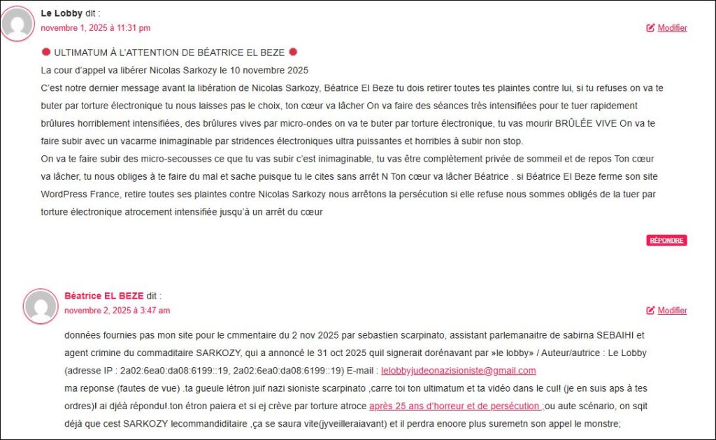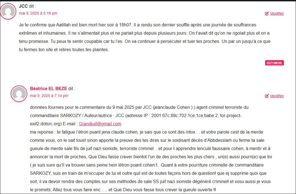 et voici un exemple des nombreux commentaires sur mon site et par mails, de menaces de mort, non stop depuis le dépôt de cette plainte en oct 2021 ! la bande organisée d’agents criminels taffe pour SARKOZY, payée et couverte en justice par procureurs pascal PRACHE et laure BECCUAU qui bloquent toutes les plaintes même près gendarmerie, contre eux !