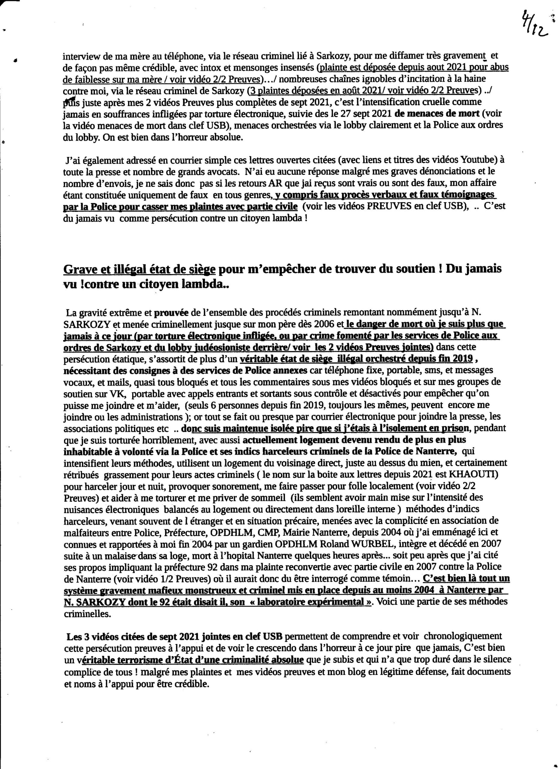 : :ma plainte contre nicolas SARKOZY, du 07 oct 2021 , suivie de menaces de mort et méthodes monstrueuses non stop